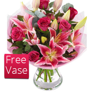 Send a smile with this gorgeous scented bouquet of pink lilies and pink roses. This bouquet may be delivered in bud to ensure the best quality. The flowers used in this bouquet are short stemmed and presented in posy style.
